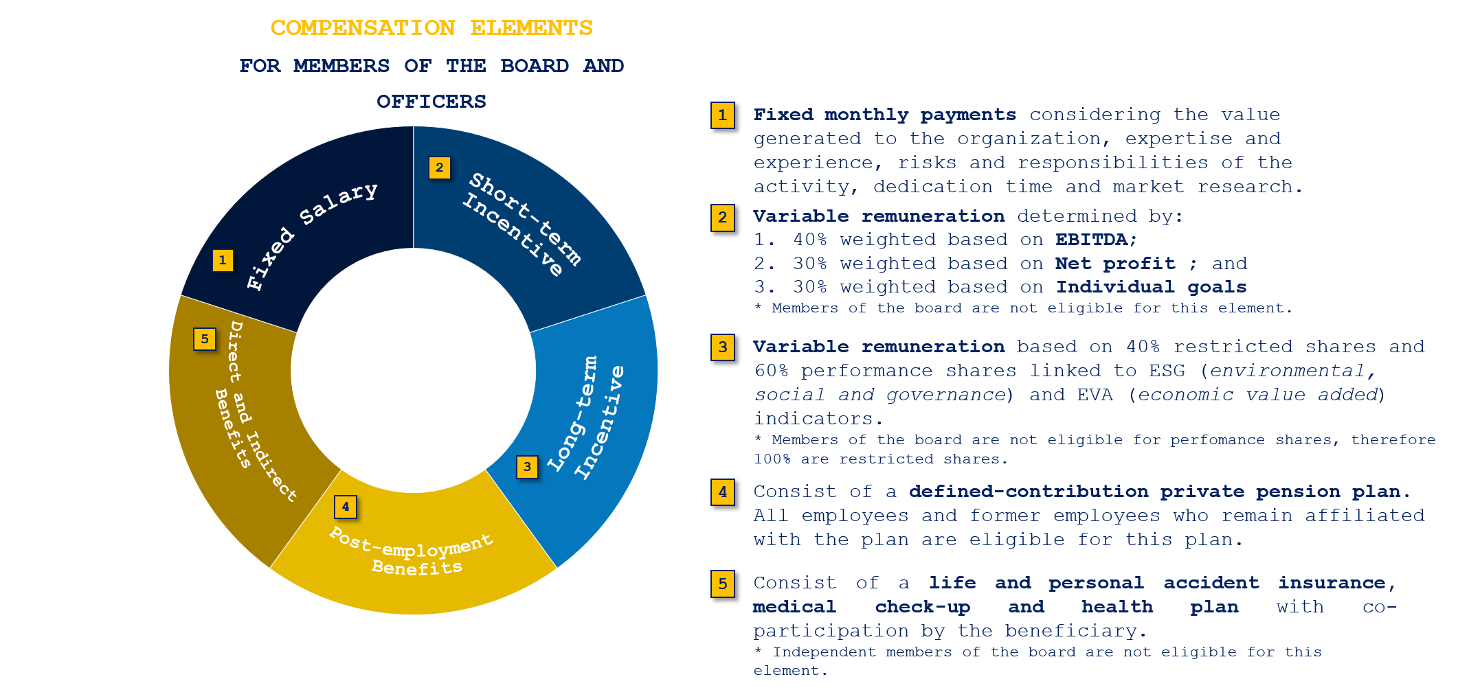 All elements of the compensation, as well as the policies that determine them, are submitted for approval by the Board of Directors with the advice of the Remuneration and Succession Committee.