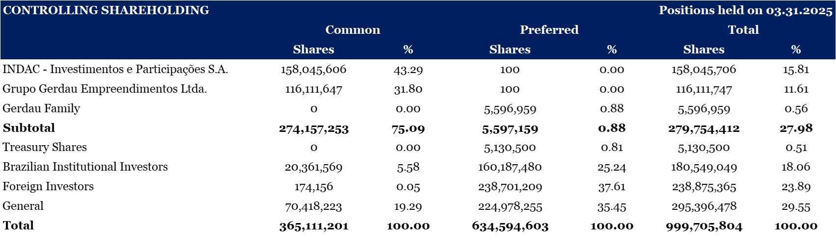 The table below shows the number of Metalúrgica Gerdau S.A. shares: